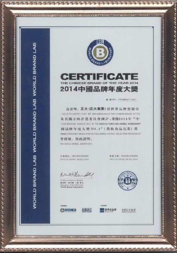 2014年12月29日,“總裁世界年會”在北京東方君悅大酒店舉行。本次大會揭曉了享有“中國品牌奧斯卡”之稱的 “世界品牌實驗室2014年中國品牌年度大獎”評選結(jié)果,正大集團、中國國航、國家電網(wǎng)、騰訊控股、中國人壽、中國國旅、北汽集團、華為技術、長虹電器等30個活躍在中國經(jīng)濟舞臺的領軍品牌榮獲 “中國品牌年度大獎”,正大集團以在農(nóng)牧食品業(yè)多年的探索實踐和管理經(jīng)驗,以及良好的產(chǎn)品品質(zhì)和品牌知名度,榮獲農(nóng)牧食品行業(yè)“中國品牌年度大獎***”榮譽稱號。哈佛商學院教授約翰?戴騰博士(John Deighton)、耶魯大學管理學院教授萊維·多爾博士(Ravi Dhar)分別進行頒獎及致詞。