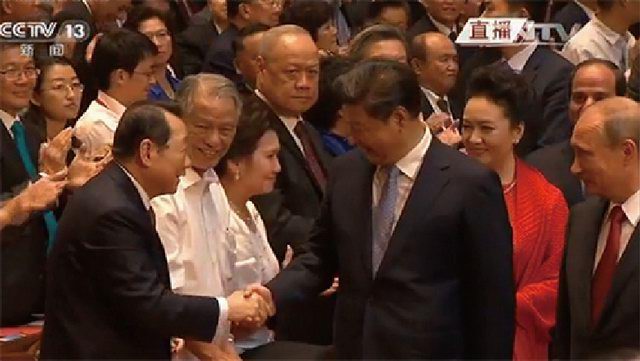 《勝利與和平》文藝晚會(huì)現(xiàn)場,習(xí)近平主席和謝國民董事長親切握手