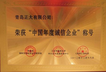在商務(wù)部國(guó)際貿(mào)易經(jīng)濟(jì)合作研究院、工業(yè)和信息化部中小企業(yè)發(fā)展促進(jìn)中心、《經(jīng)濟(jì)》雜志社聯(lián)合組織的2012年“中國(guó)年度誠(chéng)信企業(yè)”評(píng)選活動(dòng)中,青島正大有限公司榮獲“中國(guó)年度誠(chéng)信企業(yè)”殊榮。